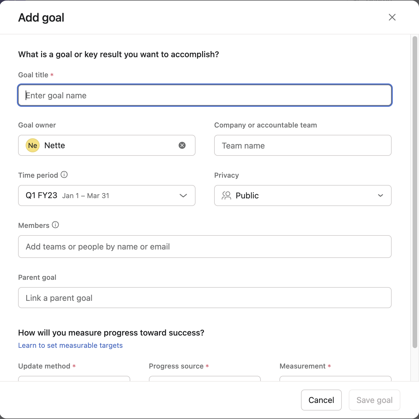 - Goal type (individual, team, or company goal)